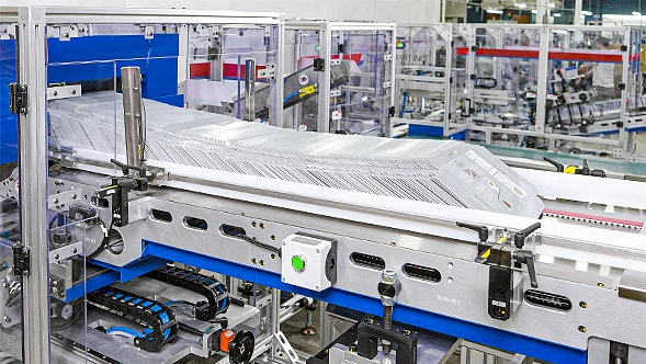 Flat-pack trays are fed into the system with precise positioning. Automated handling ensures consistent material alignment.